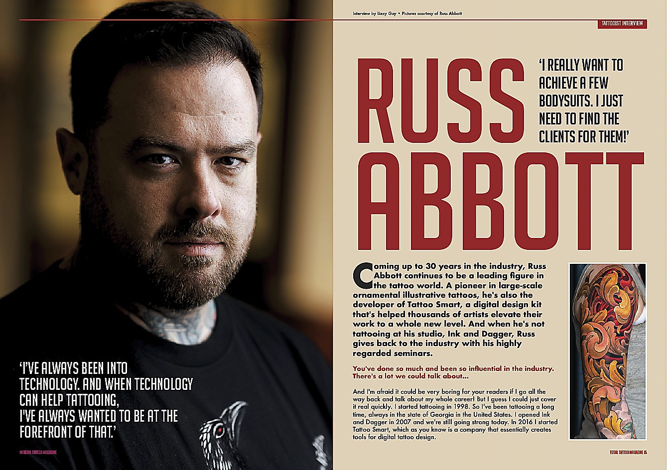 RUSS ABBOTT – Tattoo Smart, Ink & Dagger, large-scale architectural tattoos and scroll work